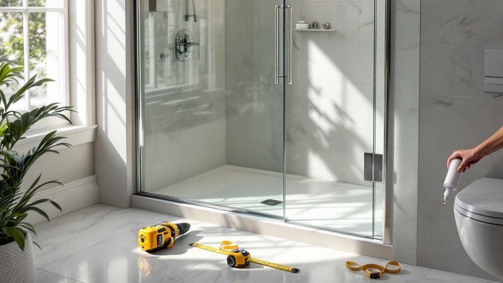 This prep phase is all about precision and a good, honest assessment of your space. Before you even think about hardware or glass styles, you have to ensure the foundation—your shower enclosure itself—is rock-solid and ready to support those heavy panels. Rushing this stage is a common mistake that almost always leads to major headaches.